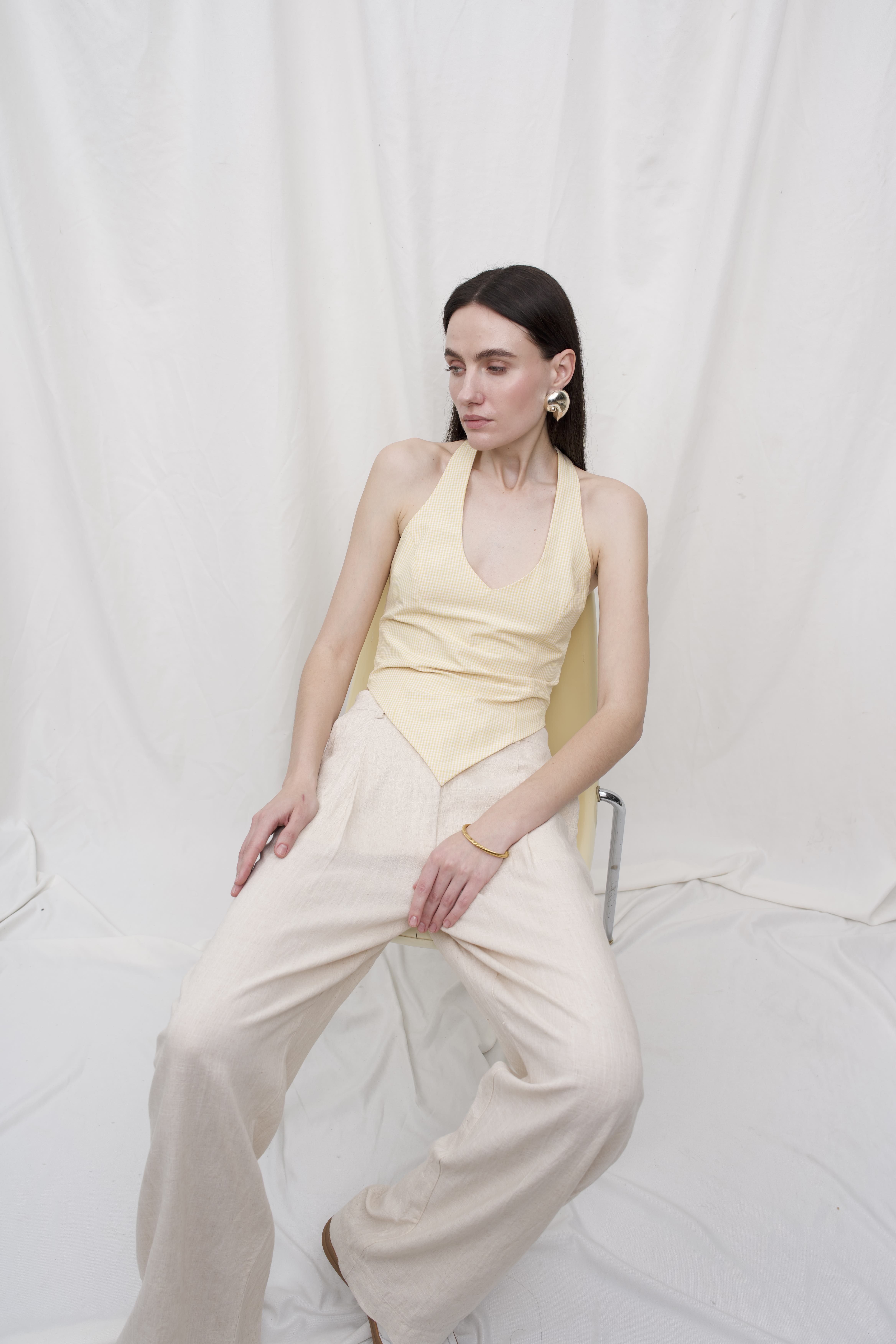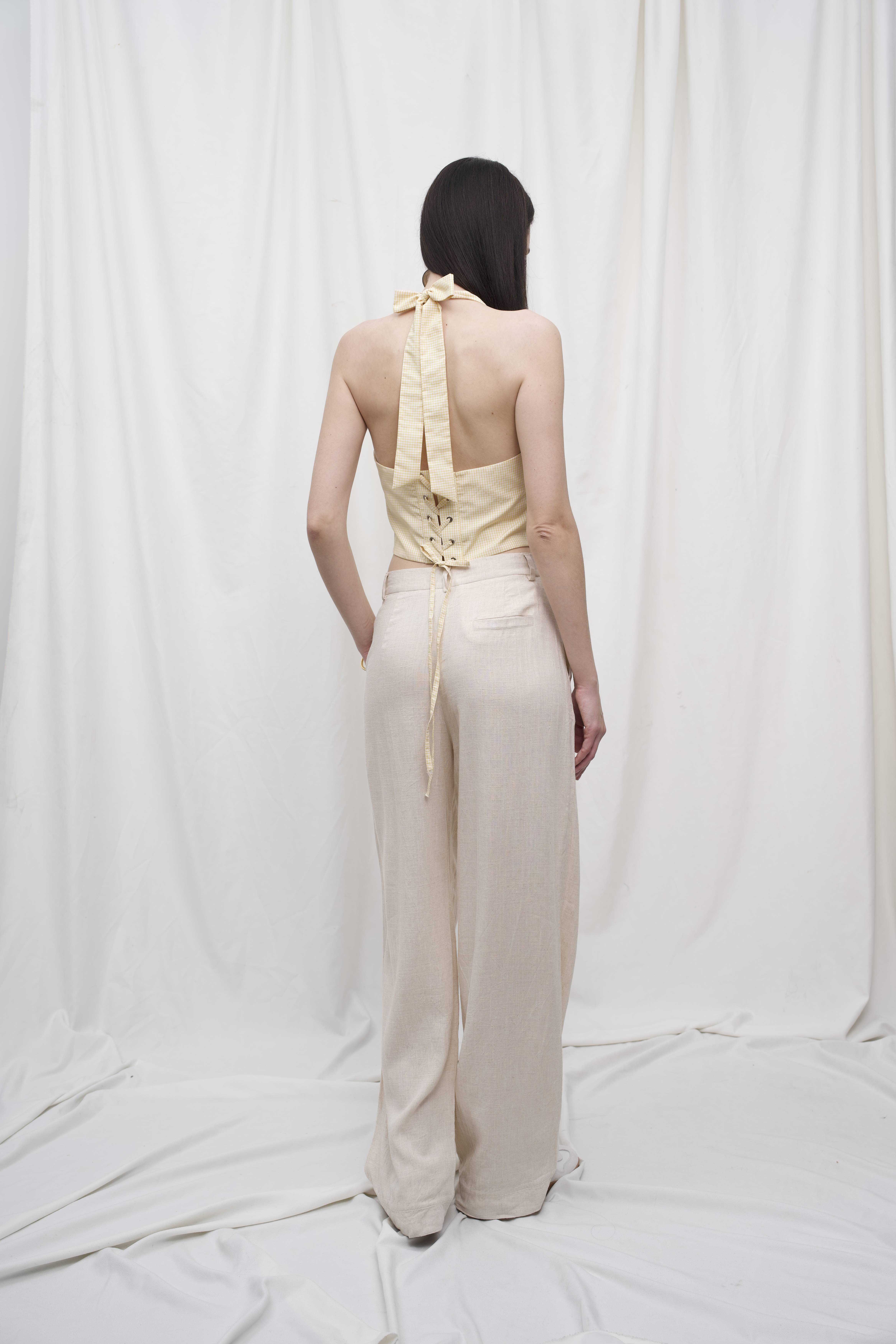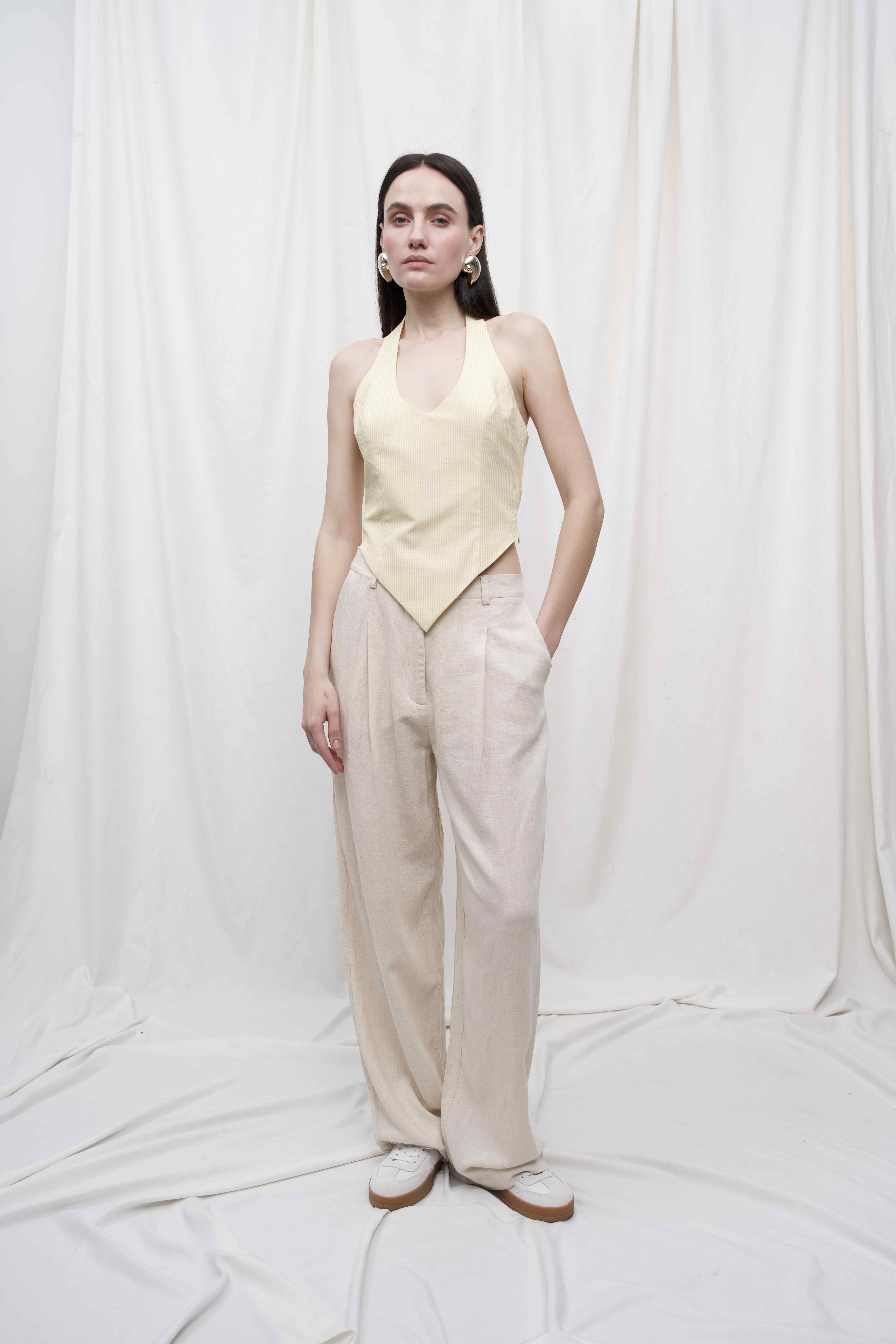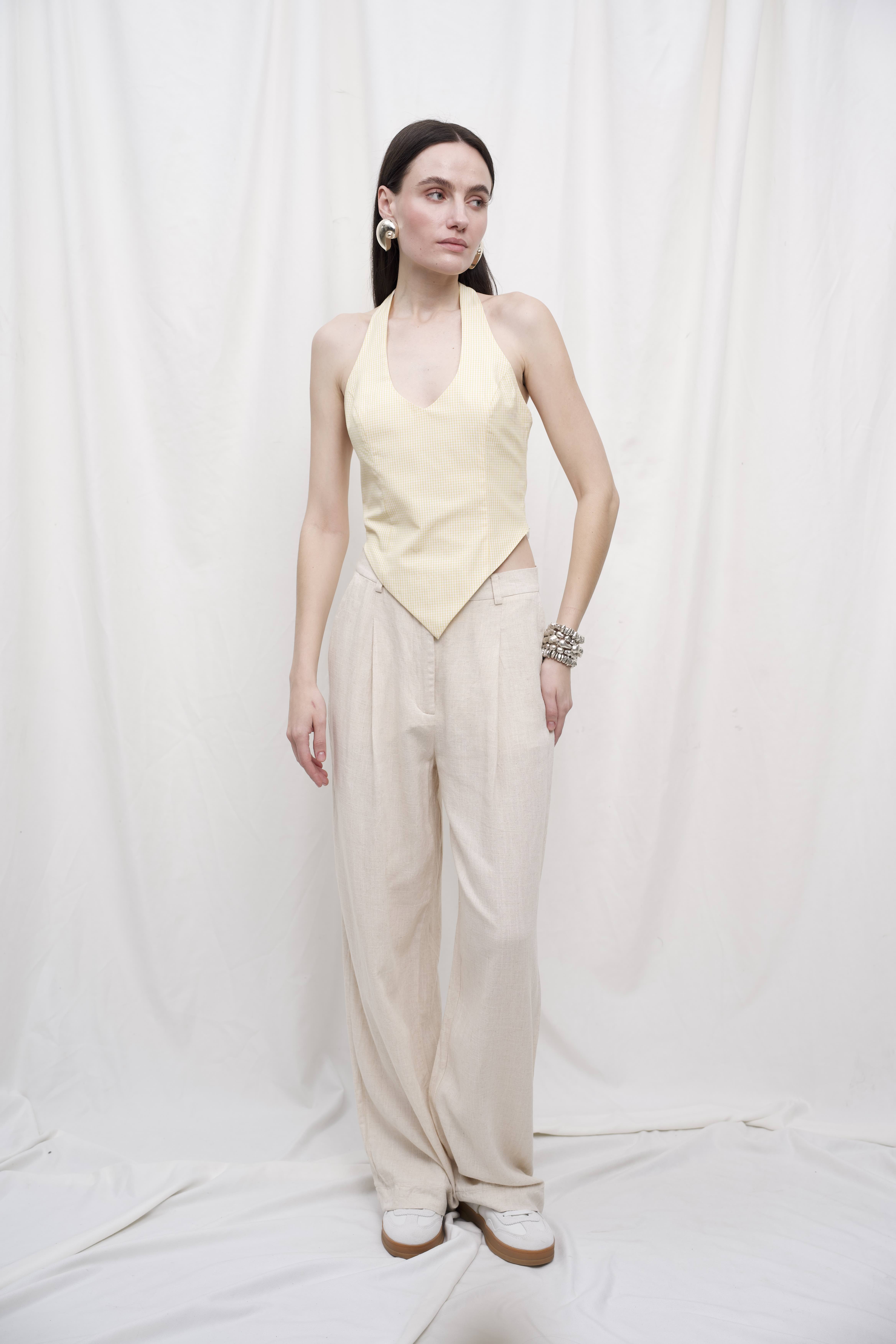Легкі штани з натурального льону — ідеальний варіант для літа. Вільний крій, м’яка складка спереду та висока посадка створюють комфортний силует і додають образу невимушеної елегантності. Виготовлені з тонкої лляної тканини, ці штани дихають, не сковують рухів і залишають відчуття прохолоди навіть у спекотні дні.