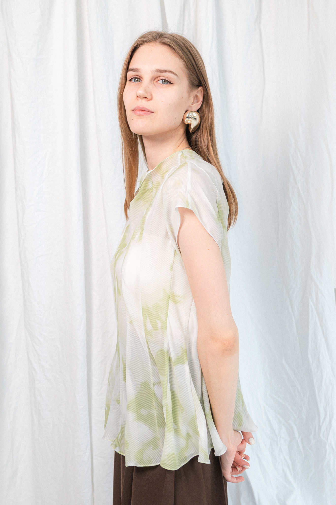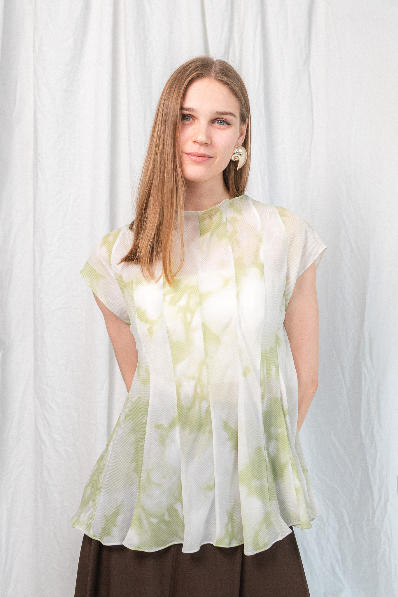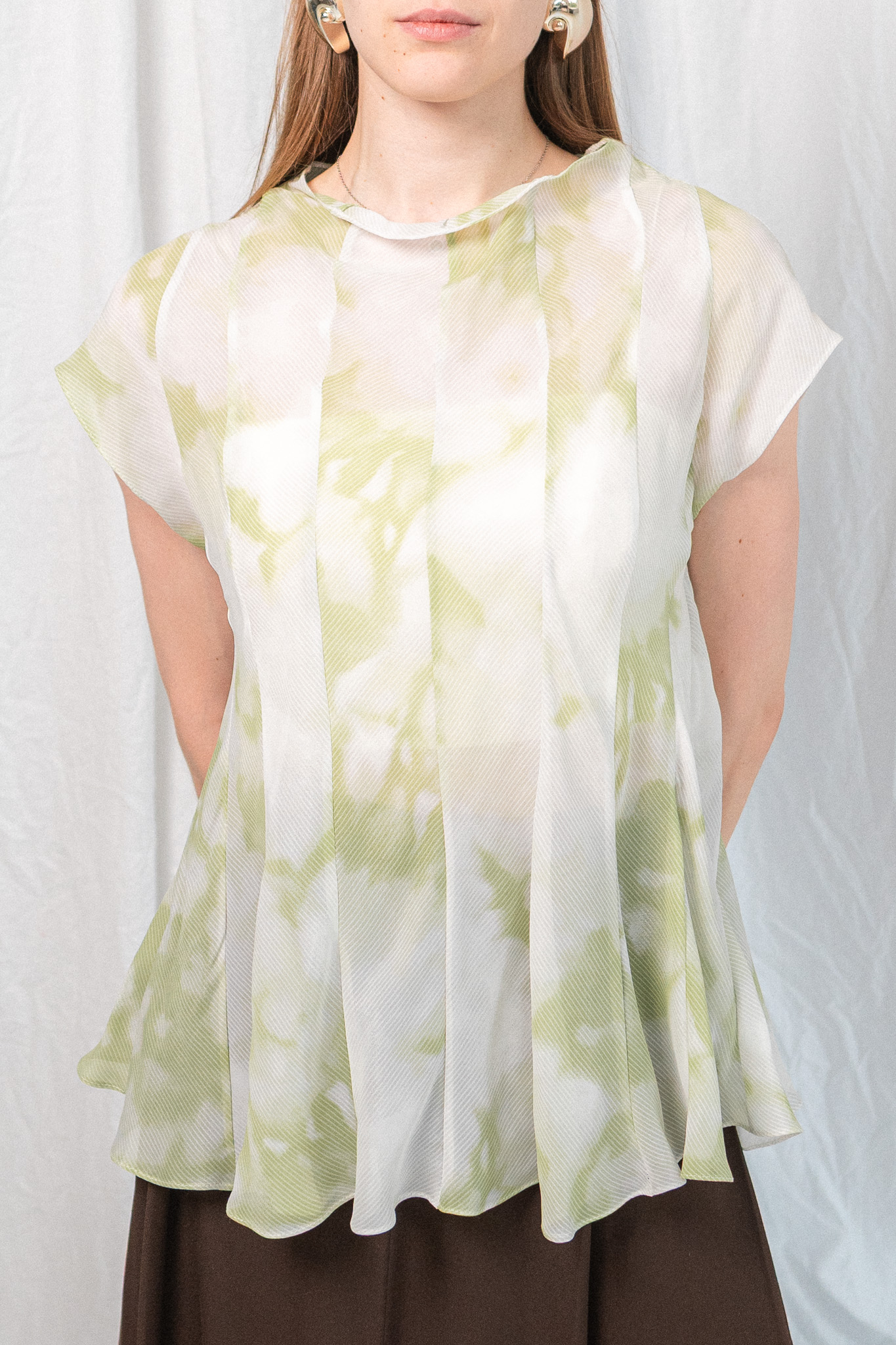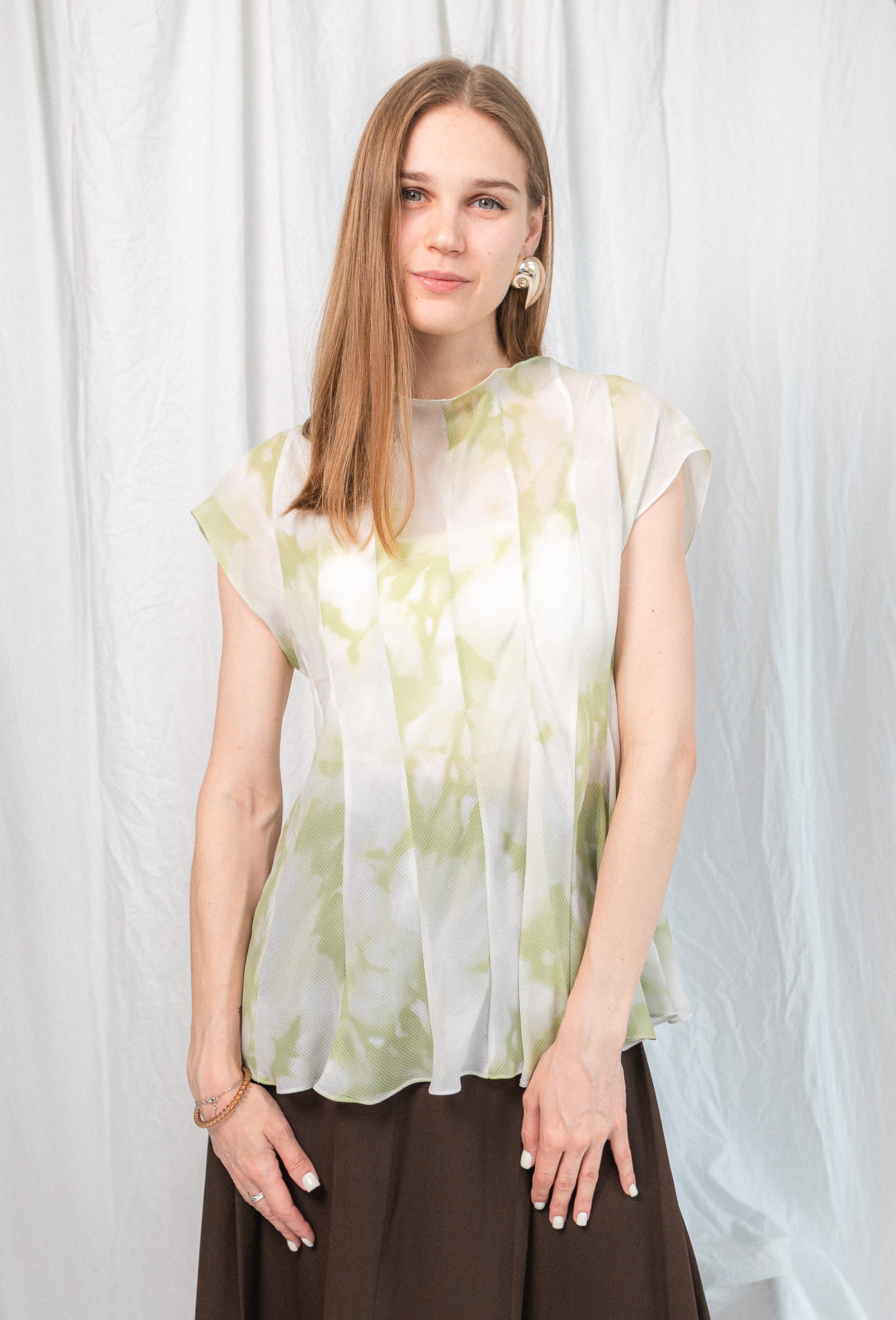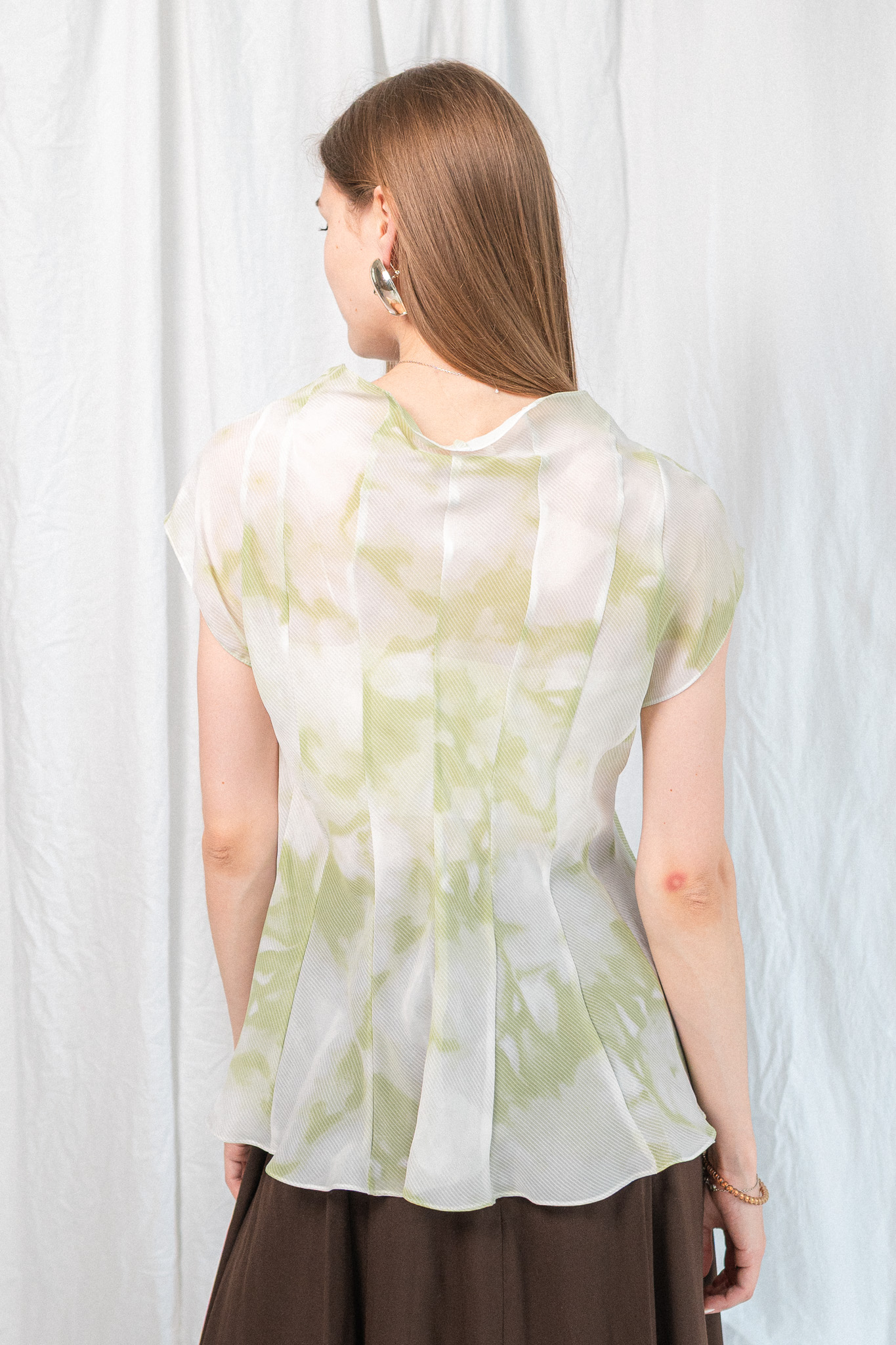 Напівпрозорий топ із приталеним силуетом та акварельним візерунком. Цей топ — мов мить, закарбована в кольорі. Легкий, майже невагомий матеріал із м’яким акварельним принтом огортає тіло, створюючи відчуття ніжності й витонченості. Конструкція з виточками підкреслює фігуру, формуючи скульптурний силует і водночас дозволяє рухатись вільно. Висока горловина додає стриманості, а розкльошена нижня частина — легкості та динаміки.
