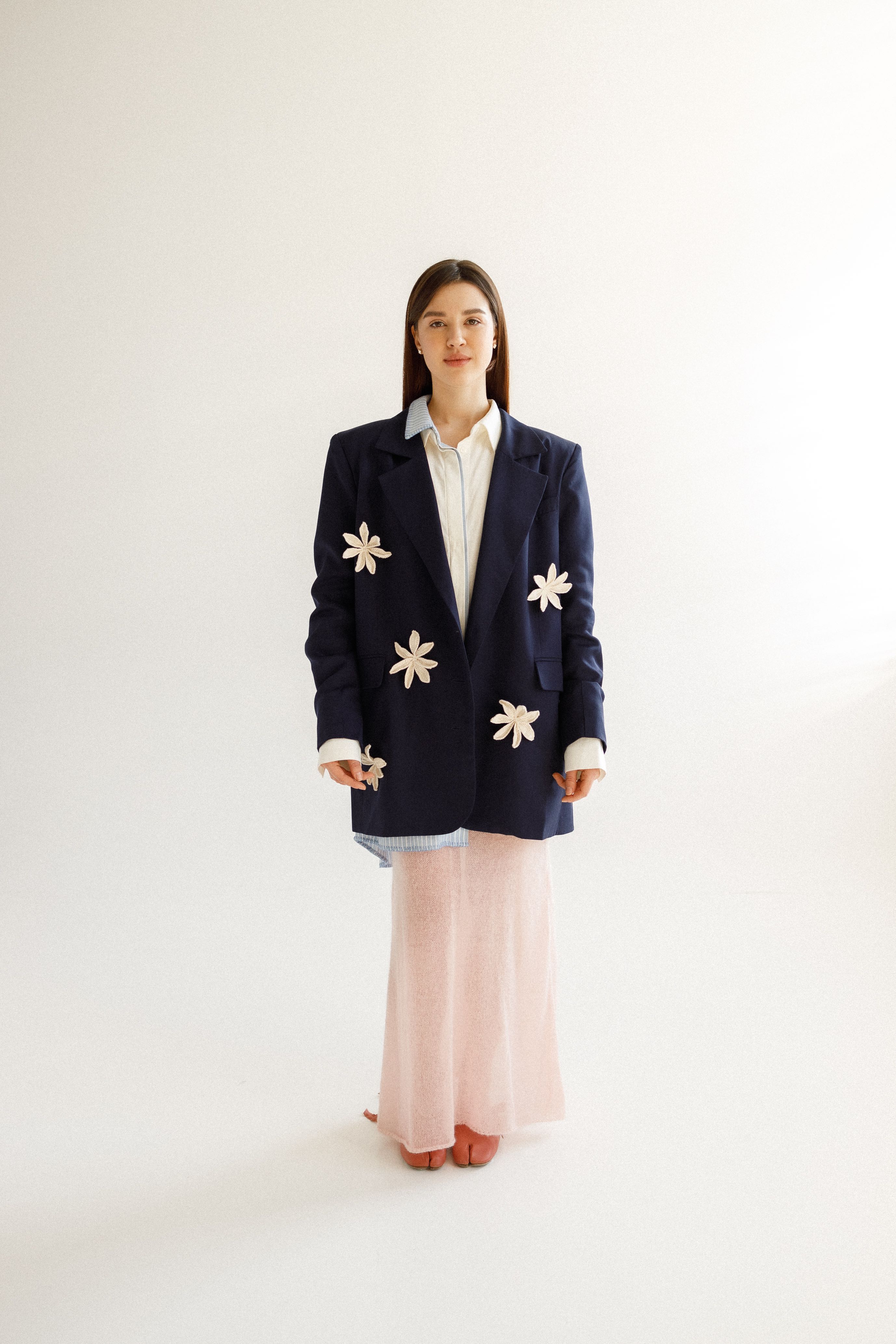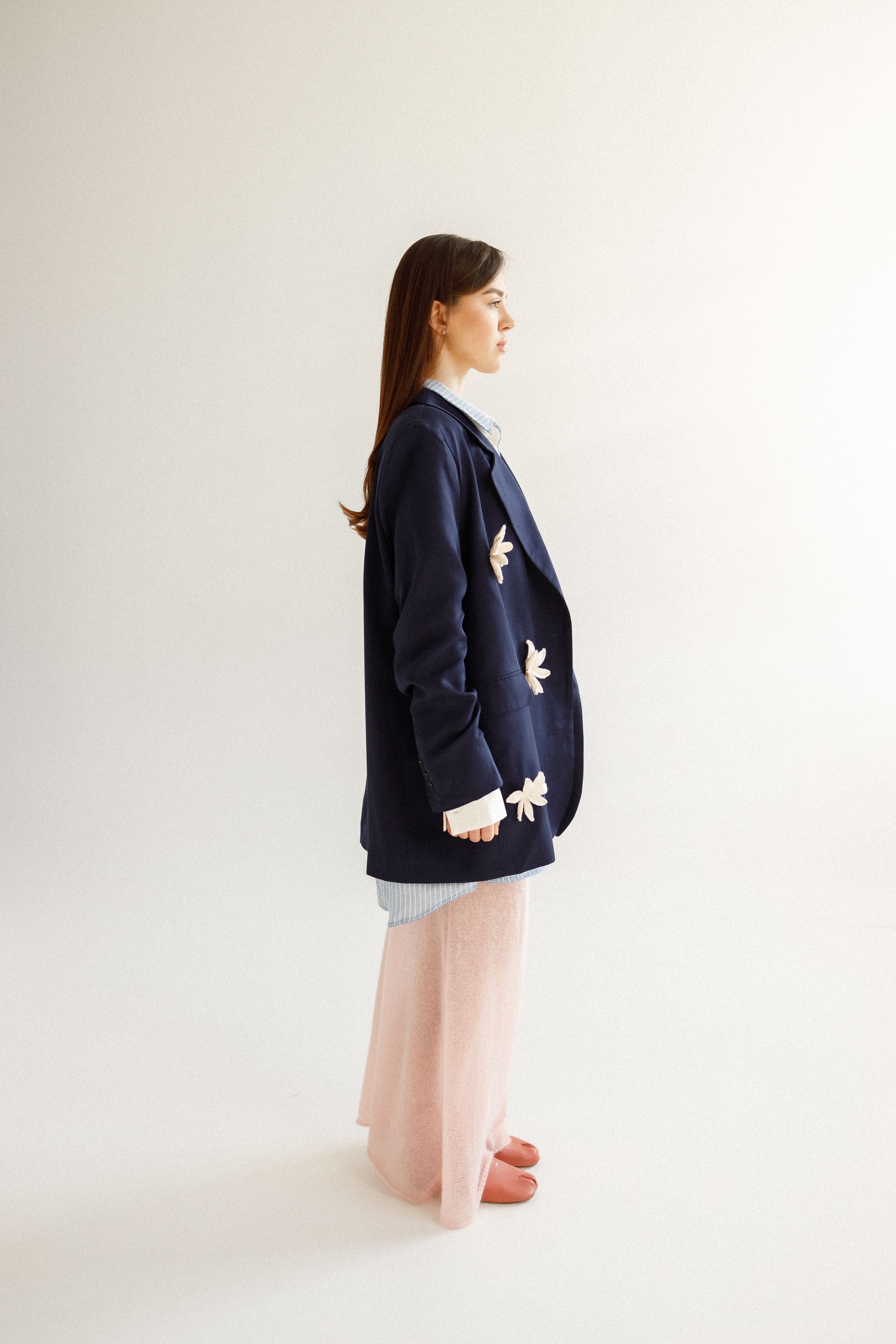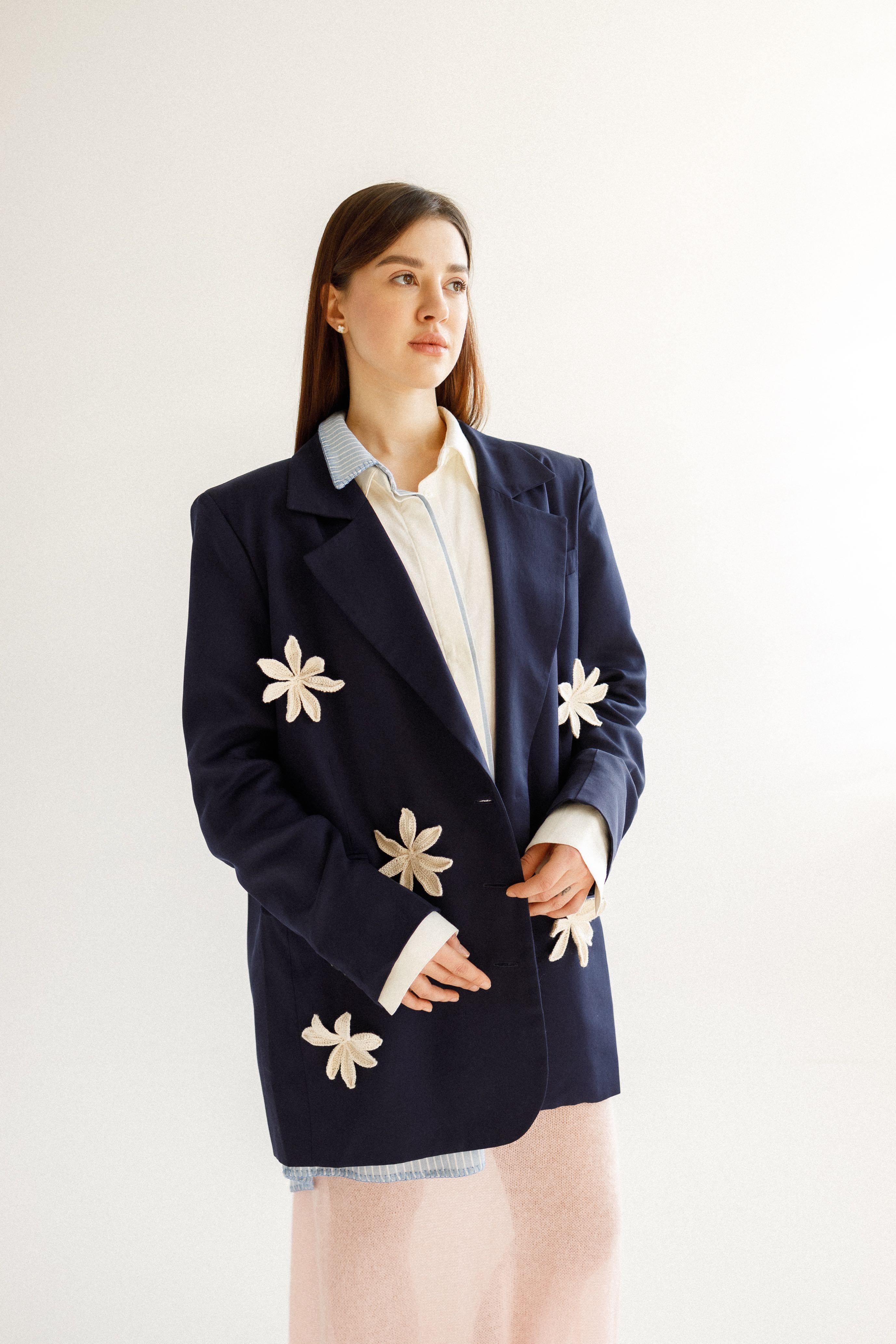 Зріст моделі 175 см. 100% тенсел. Представляємо наш блейзер темно-синього кольору з аплікацією "Квіти" - ідеальне поєднання класичного крою та чимричних чар. Ця куртка поєднує в собі вічну елегантність темно-синього кольору і нагадає про її ігрові нотки, додаючи чудові акценти до вашого професійного та повсякденного гардеробу.