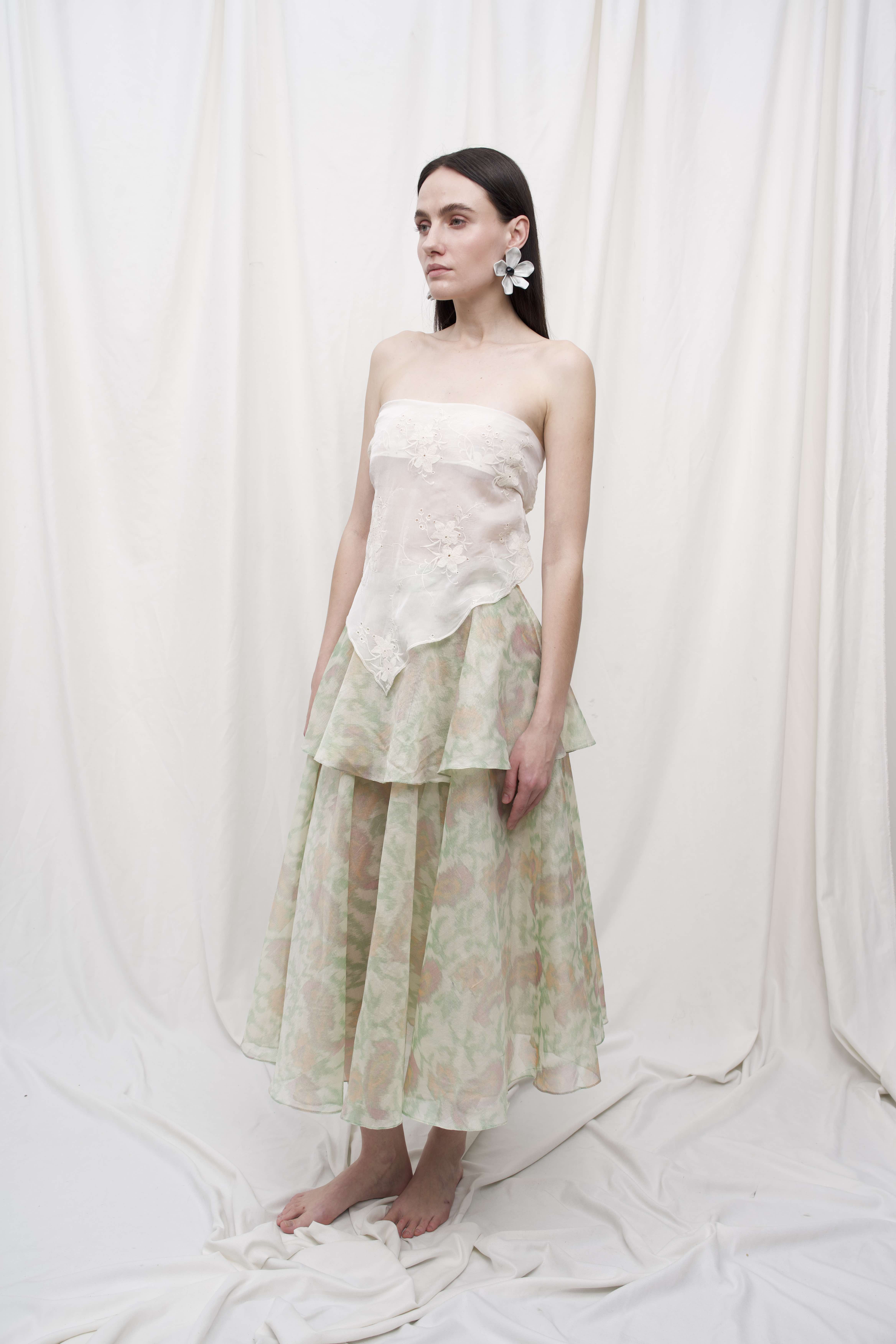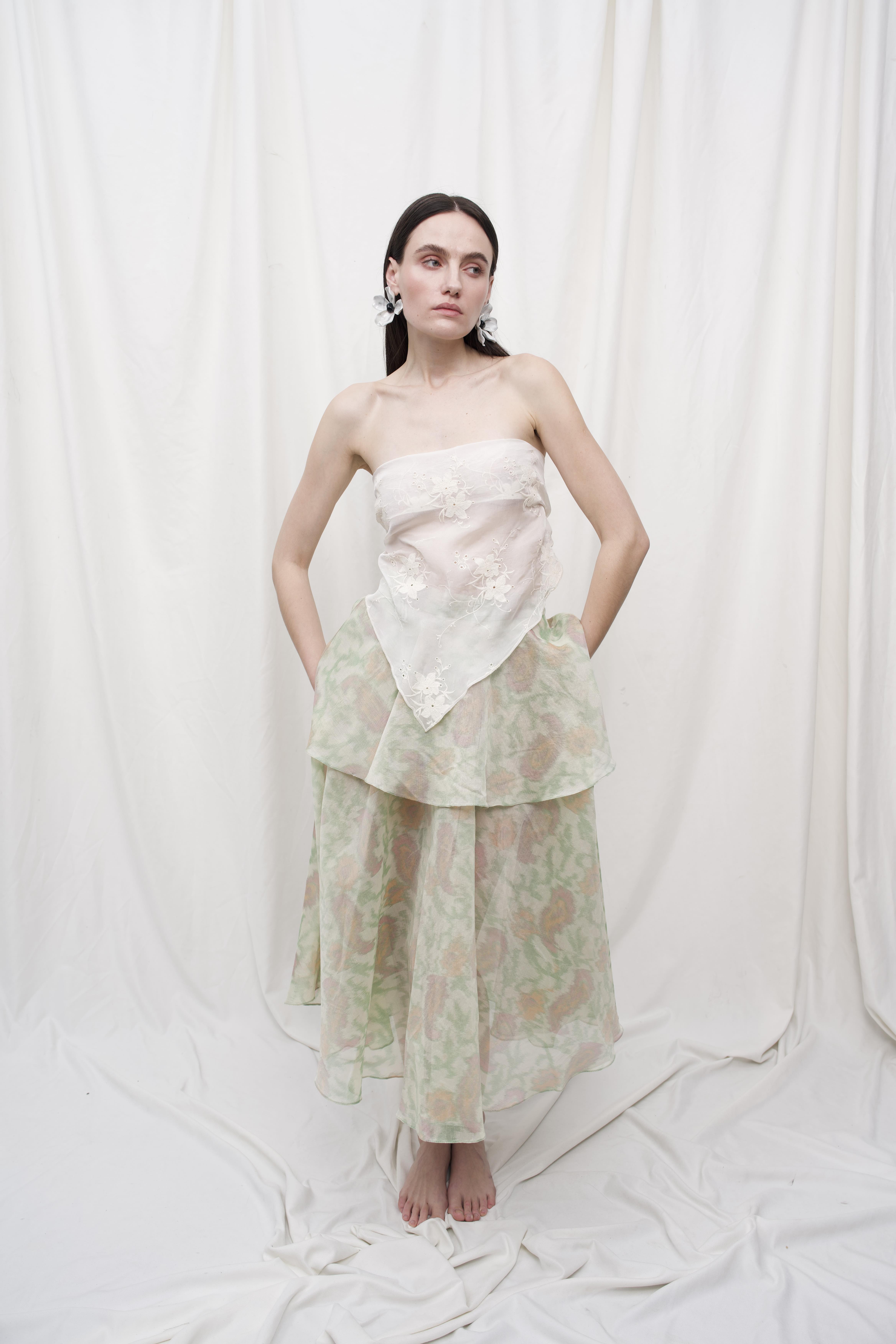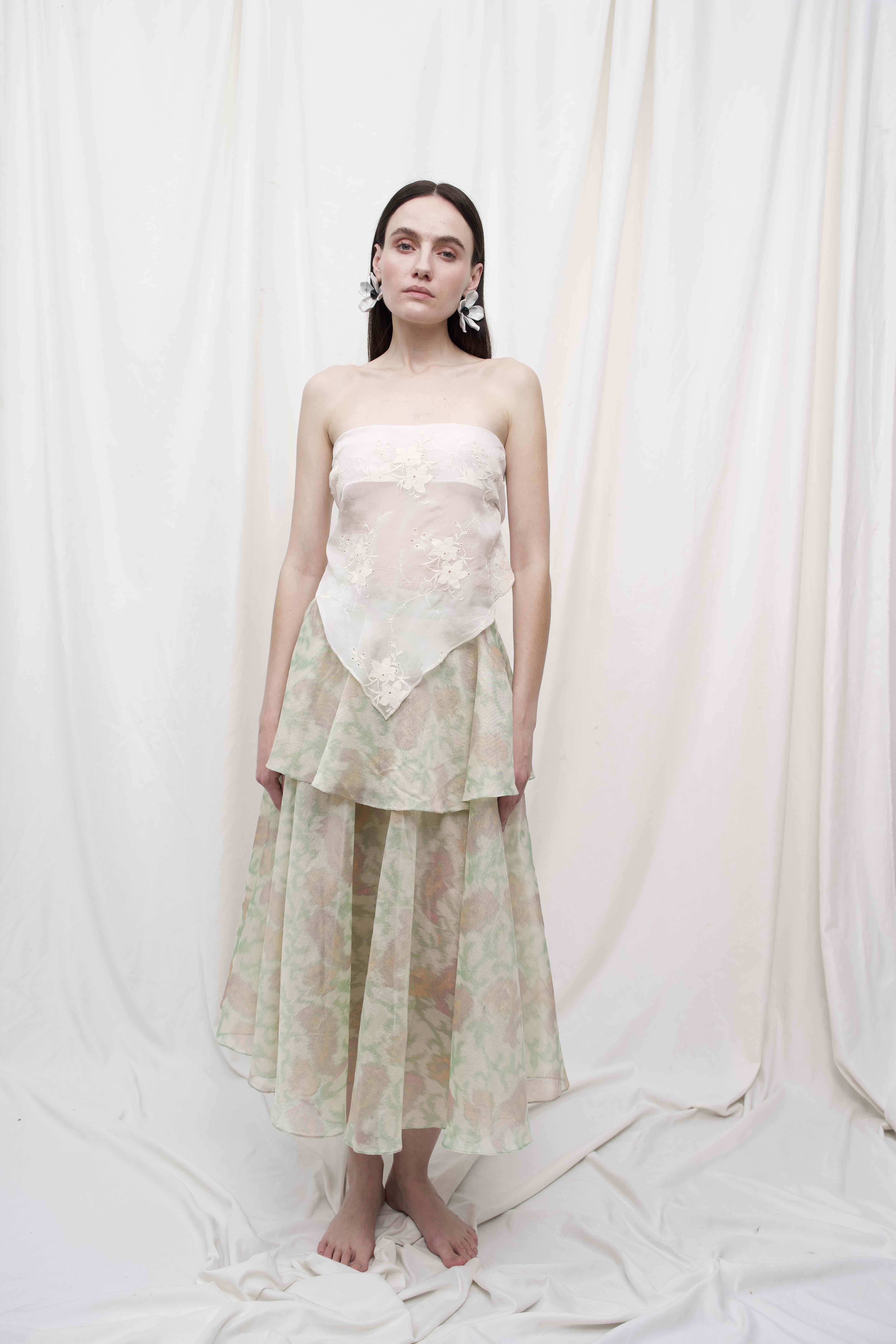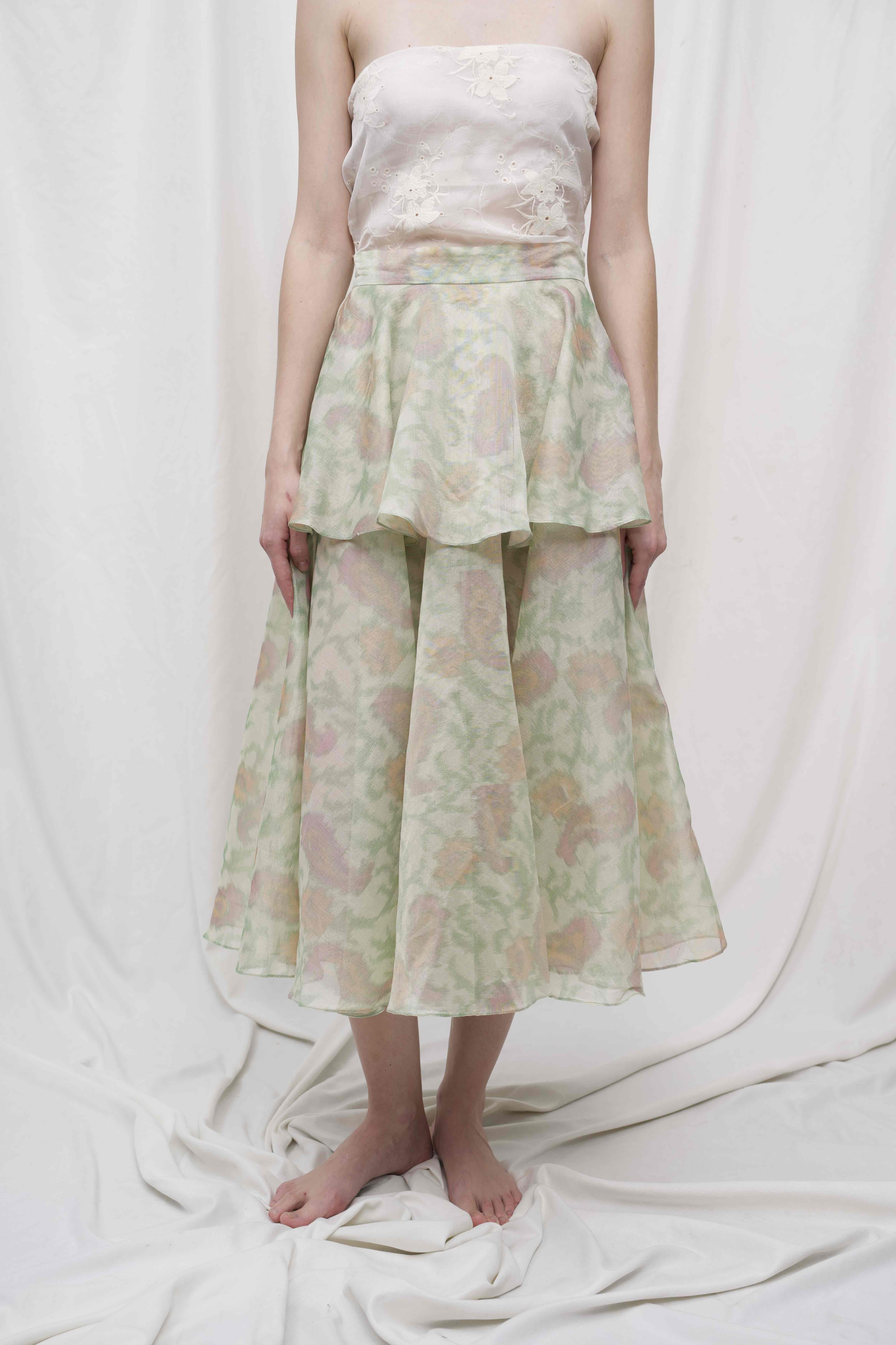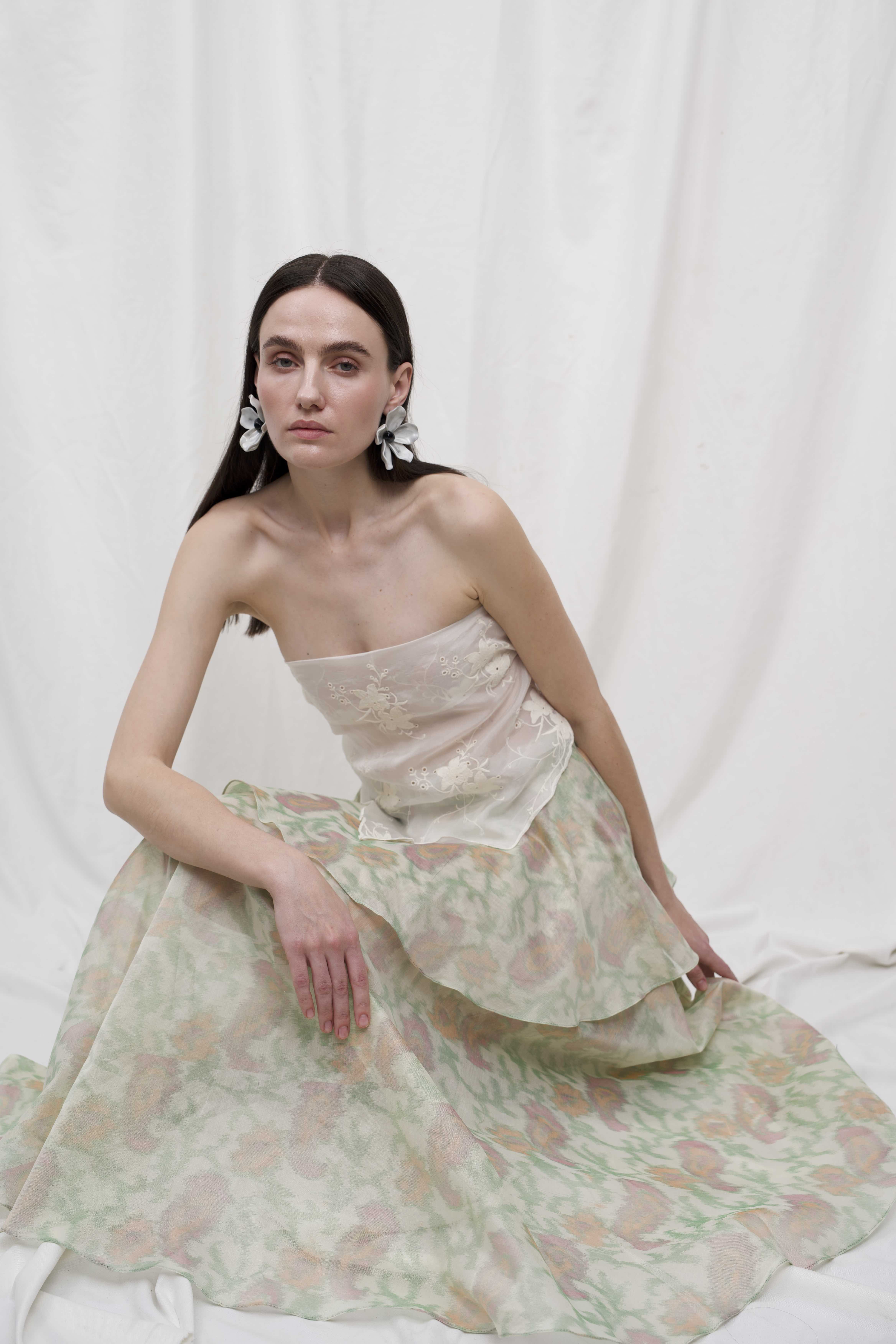 Напівпрозора міді-спідниця з ефектом багатошаровості. Ця спідниця створена з тієї ж напівпрозорої тканини, що й топ, — легкої, повітряної, з м’яким акварельним візерунком у пастельних тонах. Її форма і текстура нагадують квітку, що розкривається на тілі. Верхній шар надає багатошаровості, делікатно підкреслюючи талію й створюючи витончений силует у русі.