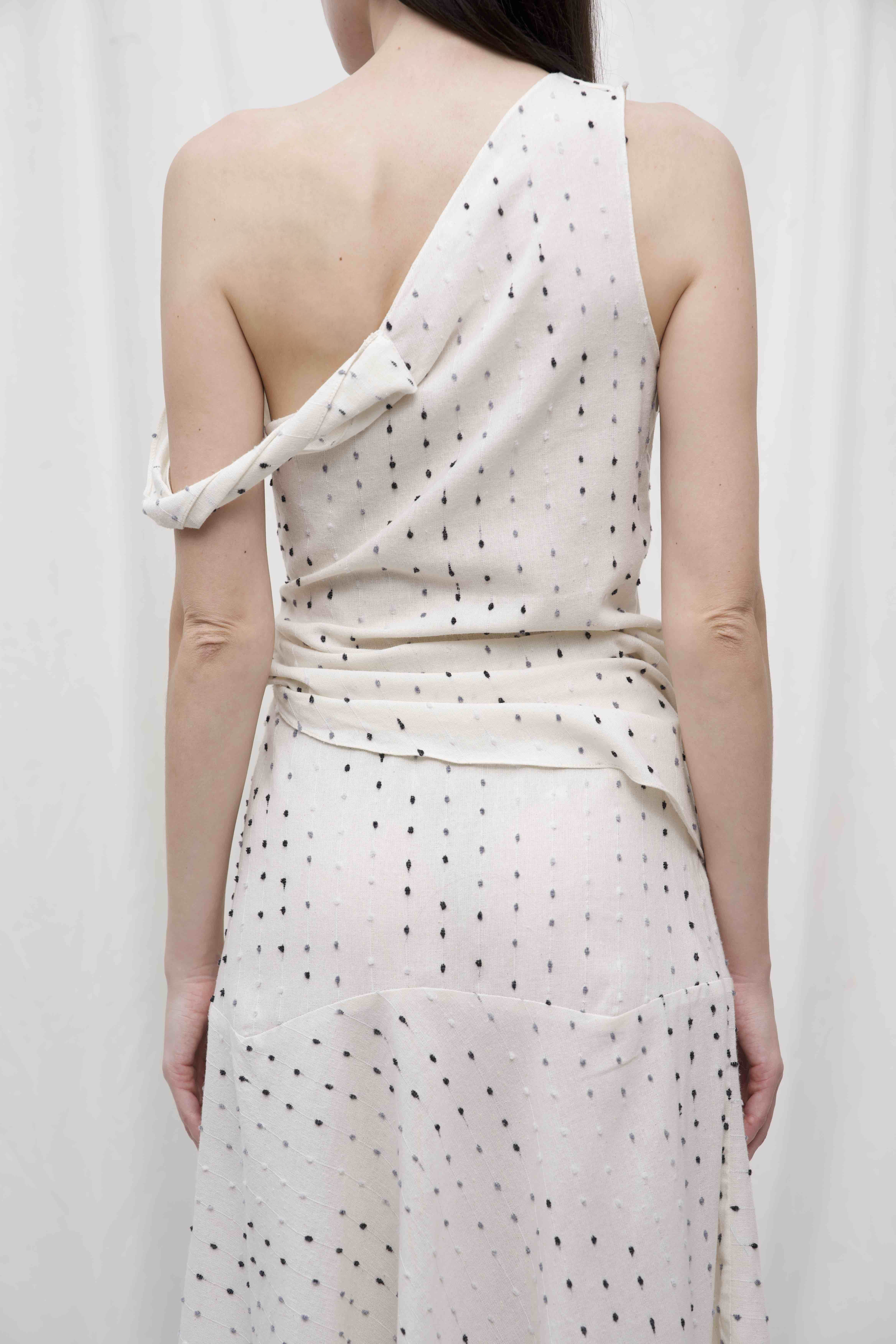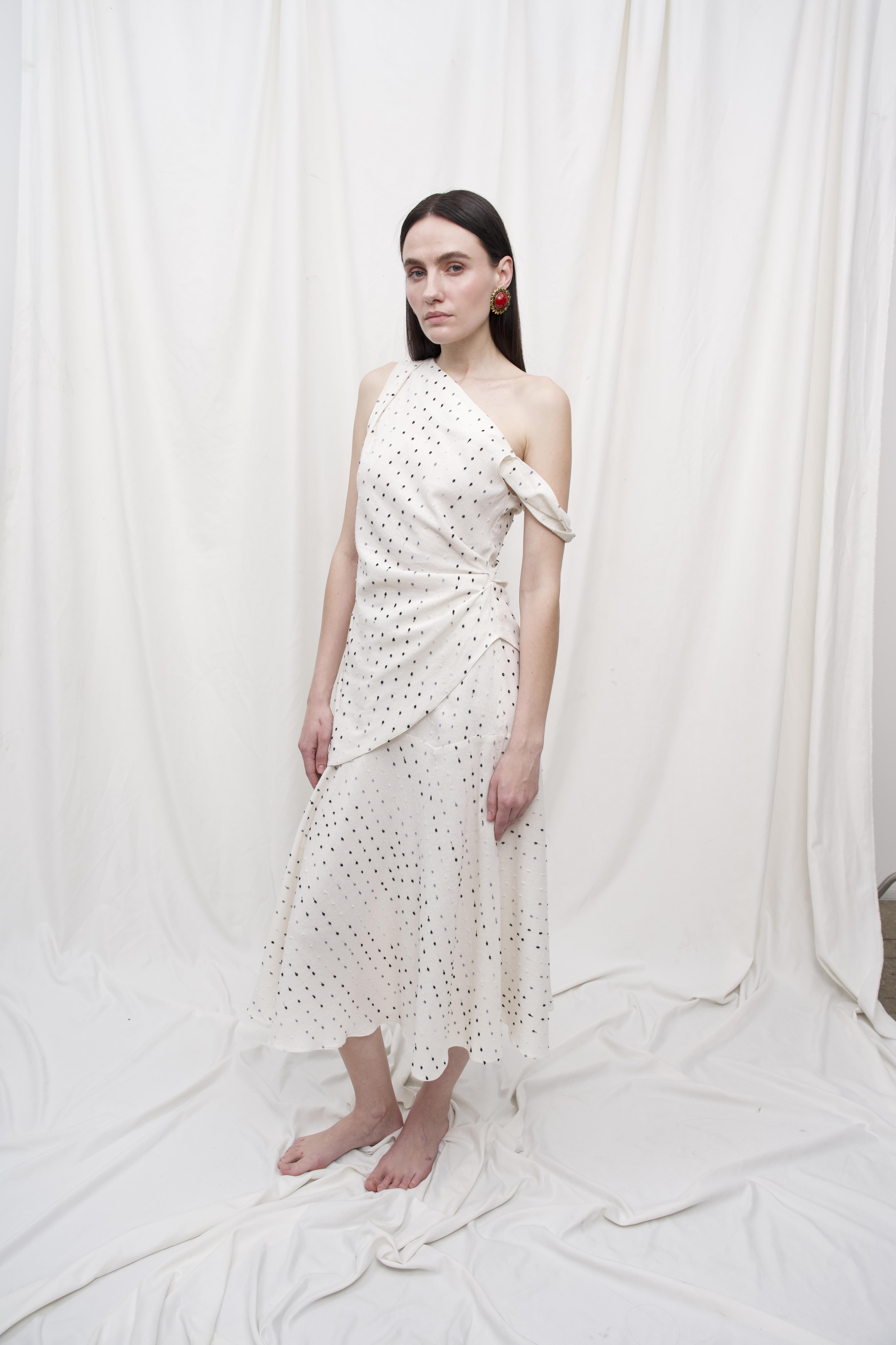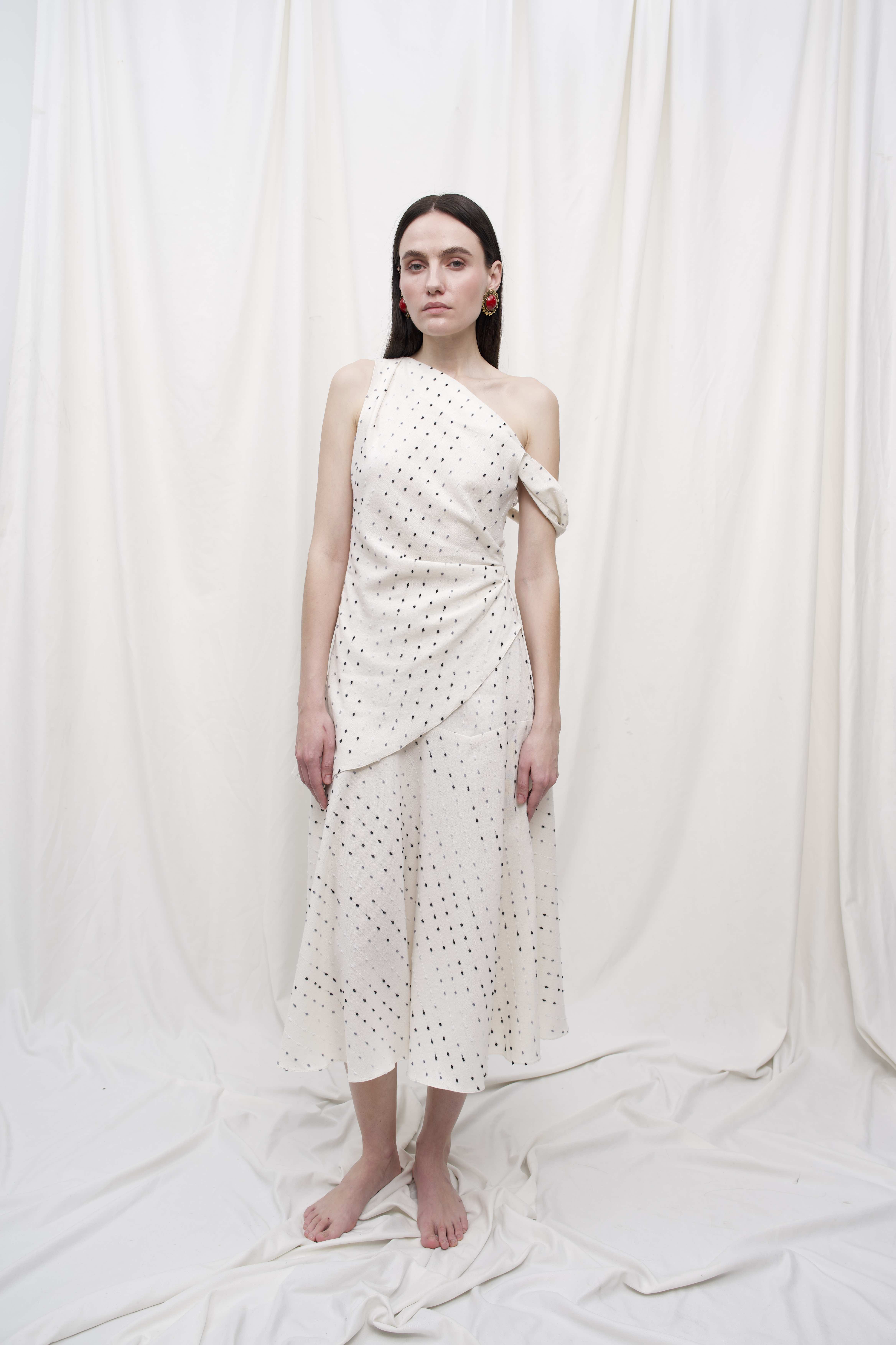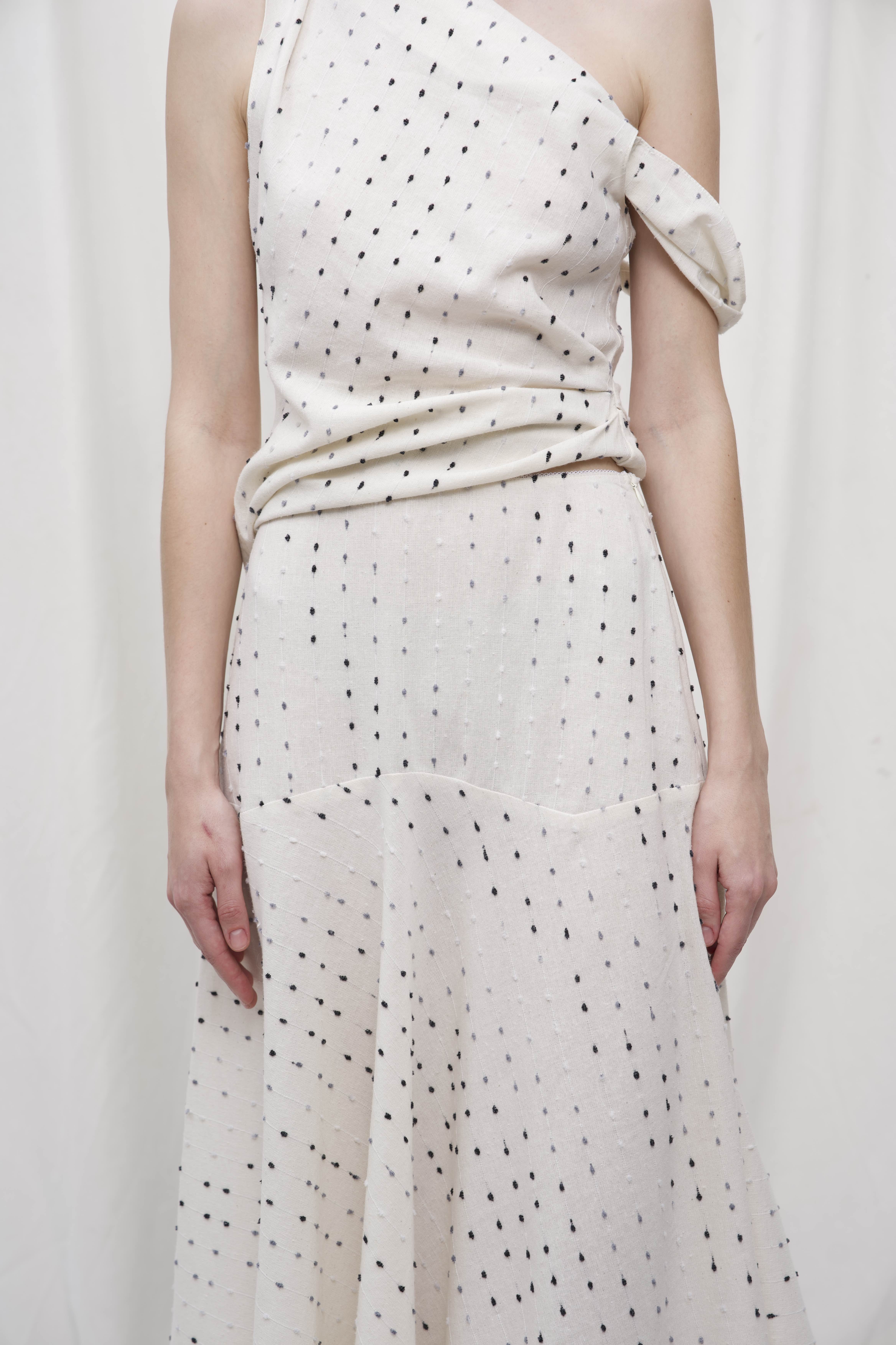 Міді-спідниця з легкої натуральної тканини - про легкість руху, простоту ліній і натуральну красу. Виготовлена з м’якої тканини білого відтінку з дрібним крапковим візерунком, вона елегантно струменить при ході, створюючи відчуття невагомості. Довжина міді додає образу стриманості й витонченості, роблячи спідницю універсальною - для міських прогулянок, побачень чи творчих вечорів.