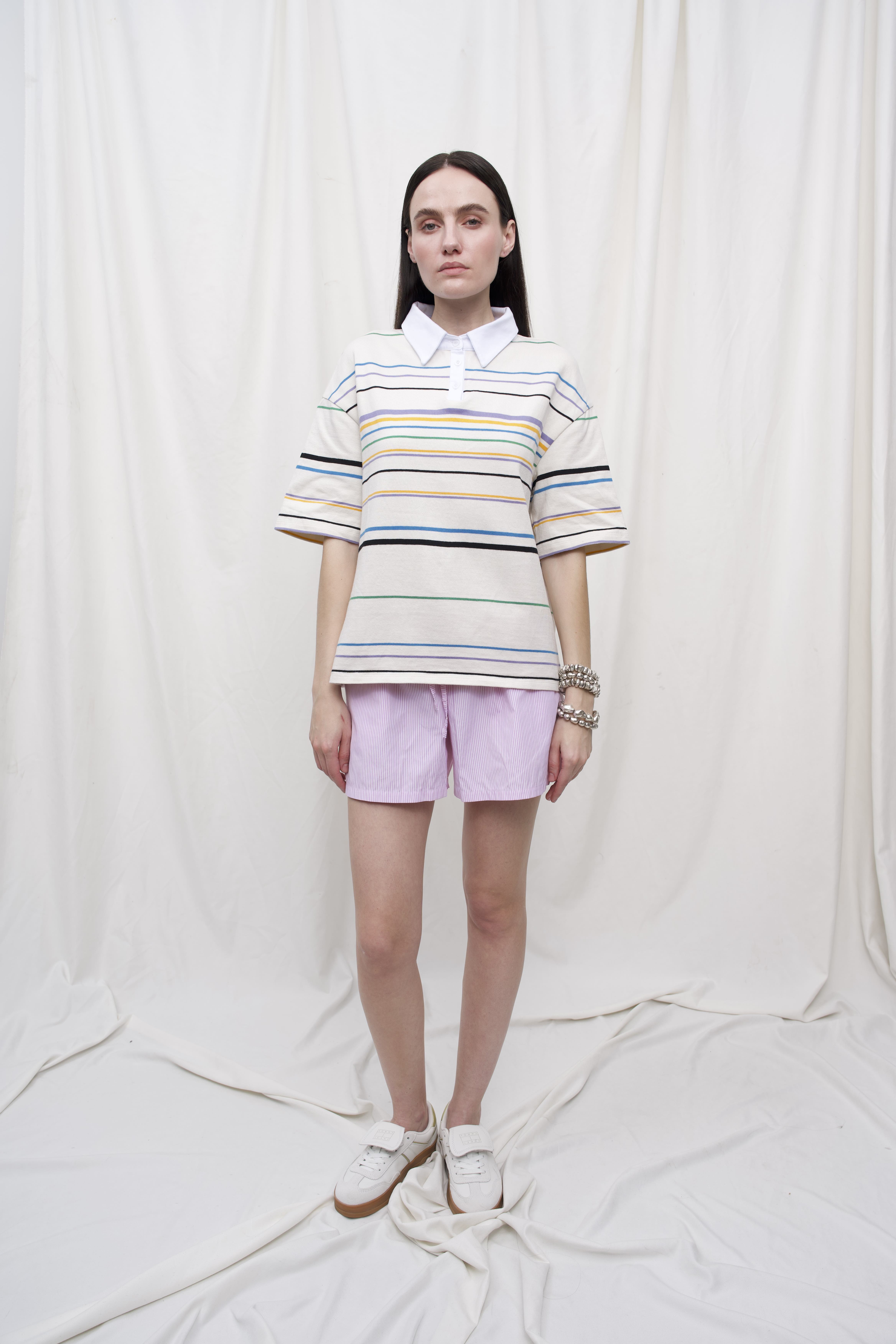 100% бавовна На моделі S Бавовняна футболка-поло з кольоровими смужками — це комфорт і стиль у щоденному образі. Модель має прямий вільний крій, широкий рукав і класичний комір з планкою на ґудзиках. Кольорова смужка додає легкості та настрою, а м’який трикотаж забезпечує приємне відчуття на тілі. Ця футболка легко поєднується як з джинсами, так і зі спідницями або лляними штанами — для неформальних літніх образів.